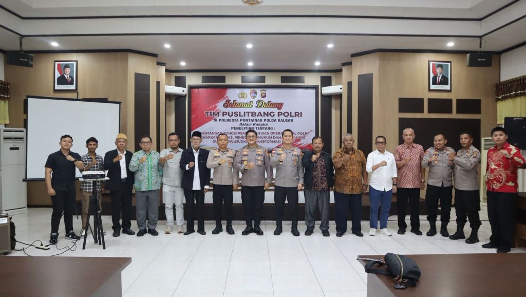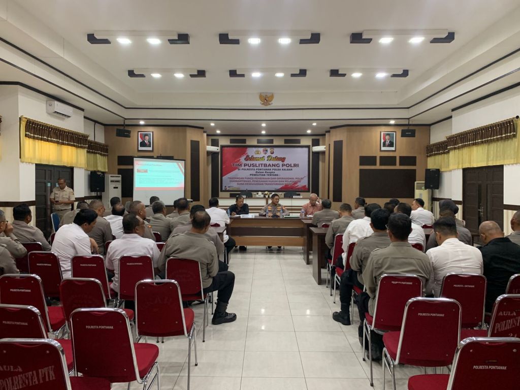 Pontianak, Polda Kalbar – Kepolisian Resor Kota Pontianak (Polresta Pontianak) menerima kunjungan Tim Pusat Penelitian dan Pengembangan (Puslitbang) Polri bersama Badan Riset dan Inovasi Nasional (BRIN) dalam rangka pelaksanaan penelitian strategis mengenai “Tantangan Fungsi Pembinaan dan Operasional Polri Guna Mewujudkan Transformasi Polri (Harkamtibmas, Penegakan Hukum, dan Pelayanan).” Kegiatan tersebut berlangsung di Aula Polresta Pontianak, Senin (8/12/2025).