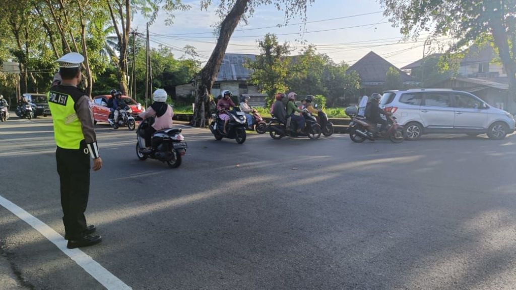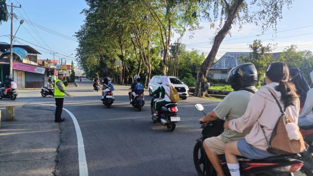 Petugas tampak sigap membantu pengendara, khususnya para pelajar dan pekerja yang melintas di kawasan tersebut. Selain mengatur lalu lintas, personel juga memberikan imbauan tertib berkendara guna mencegah potensi kecelakaan.