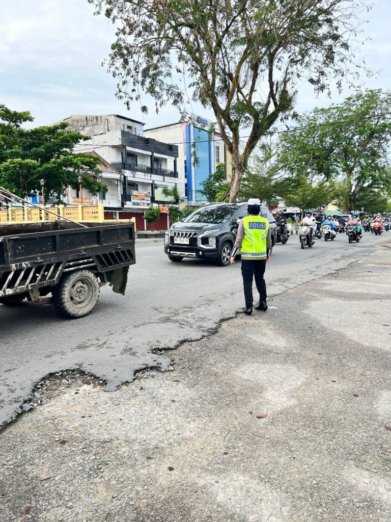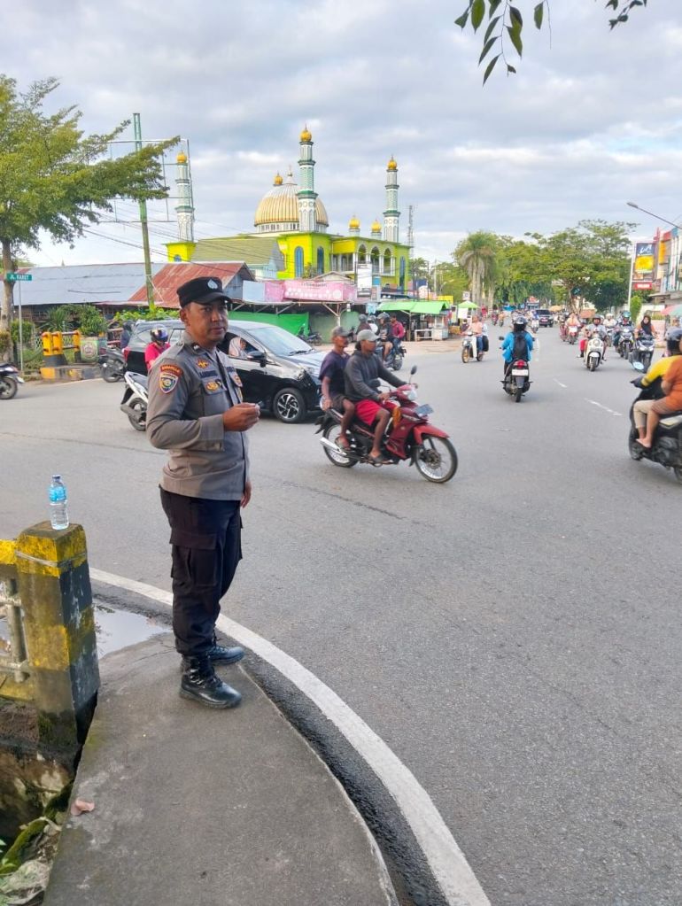 Personil Polsek Pontianak Barat tampak berjaga dan mengatur arus lalu lintas di depan pusat-pusat aktivitas masyarakat, seperti di persimpangan jalan, pasar teratai dan sekolah.