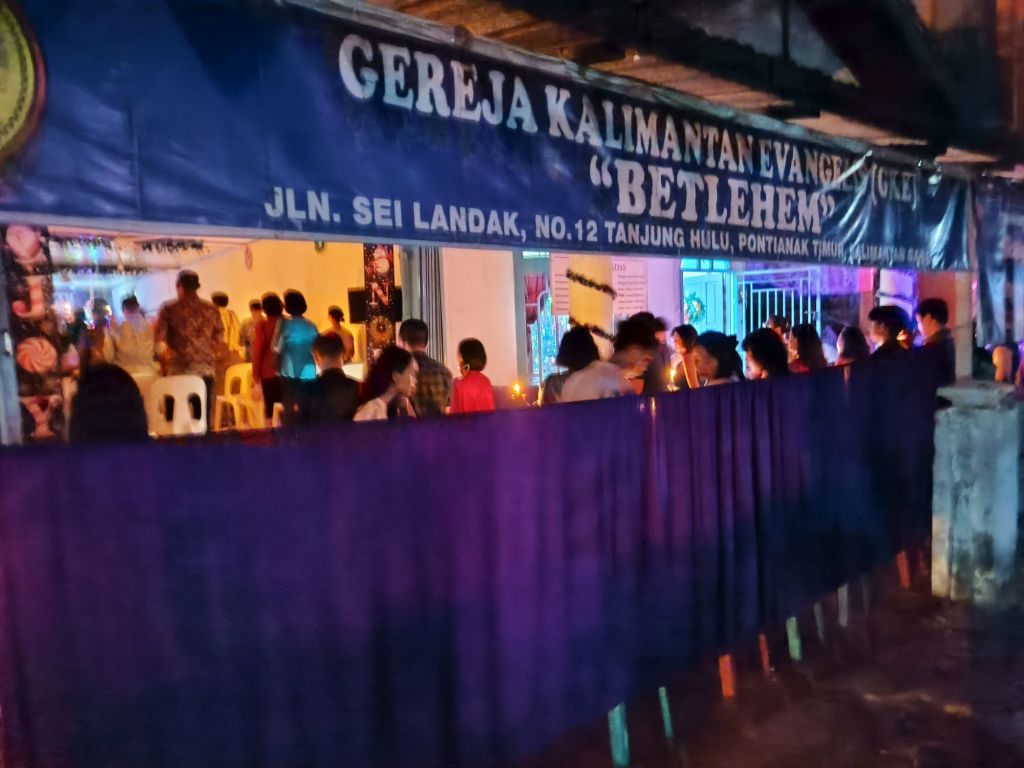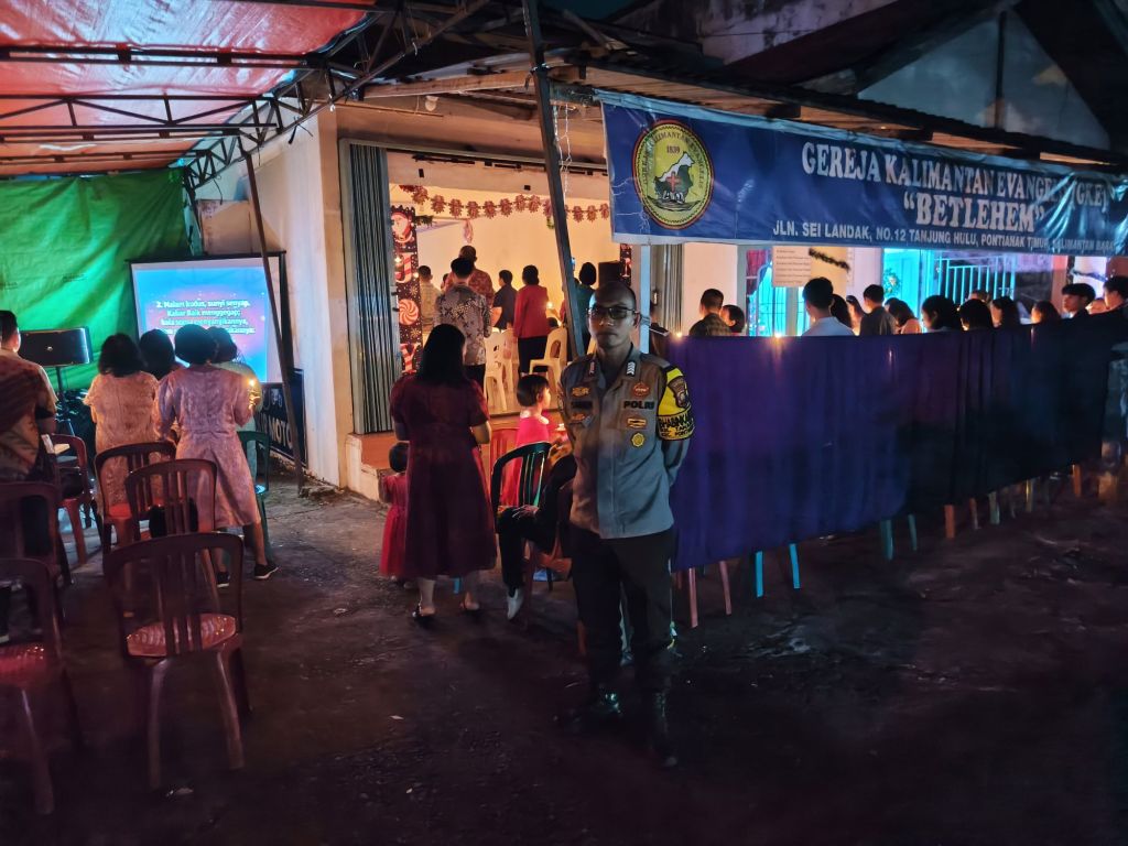 Pontianak, Kalbar – Bhabinkamtibmas Kelurahan Tanjung Hulu, Bripka Sabirin, melaksanakan kegiatan pengamanan (Pam) ibadah kebaktian di Gereja GKE Betlehem yang berlokasi di Jalan Sei Landak Timur, Perum 4, wilayah hukum Polsek Pontianak Timur, pada hari Minggu malam, (22/12/2025).