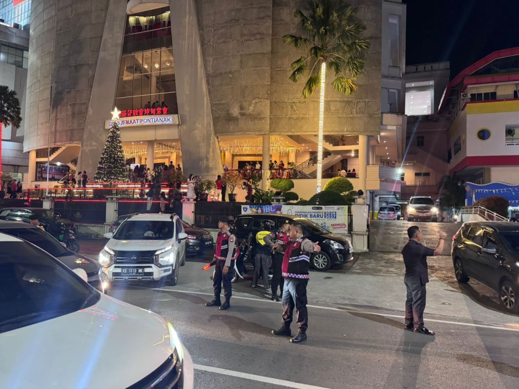 Pontianak, Polda Kalbar – Personel Polresta Pontianak yang terploting di Pos Pengamanan (Pos Pam) Gajah Mada menunjukkan kesiapsiagaan dalam melayani dan mengamankan jemaat umat Kristiani yang melaksanakan ibadah Misa Natal Gereja GKKB Jemaat Pontianak, Rabu malam, 24 Desember, dalam rangka Operasi Lilin Kapuas 2025.