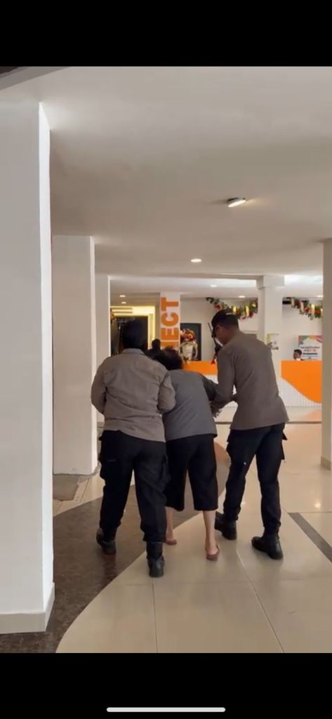 Dengan sigap, personel kemudian membantu jemaat tersebut dengan menggandeng tangannya dan membimbing menuju tempat yang dituju di dalam gereja.
