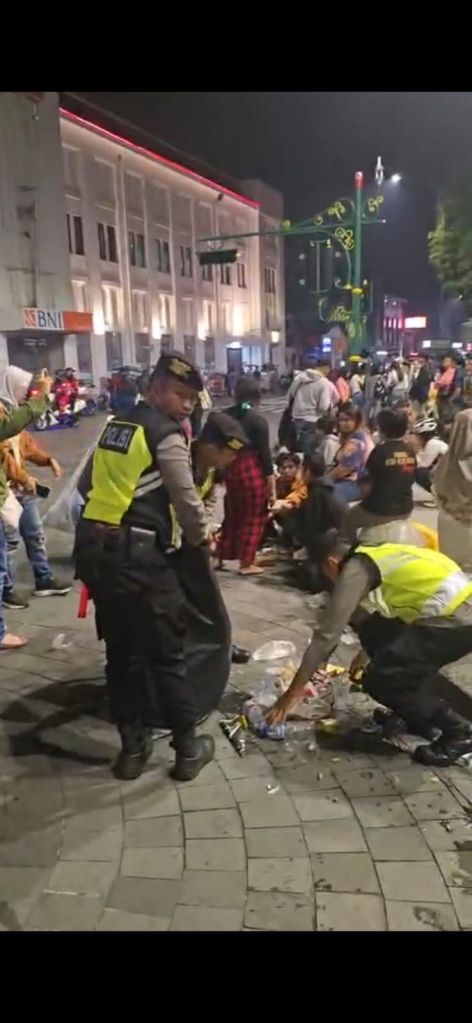 Sejumlah personel kepolisian tampak memunguti sampah yang berserakan di sepanjang kawasan Titik Nol KM. Sampah tersebut merupakan sisa aktivitas masyarakat yang merayakan malam pergantian tahun di lokasi tersebut.