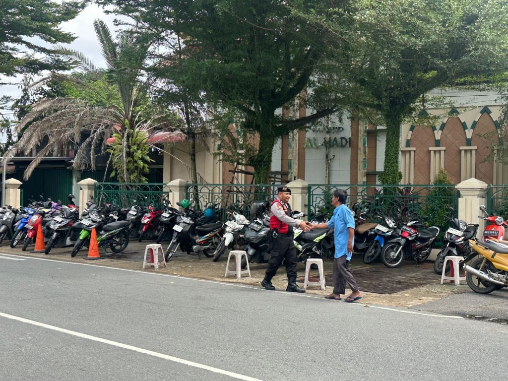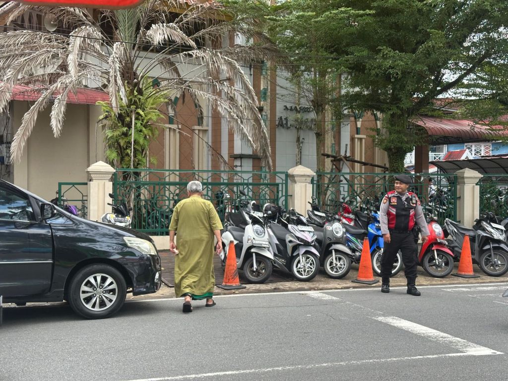 Sejumlah personel disiagakan di depan masjid serta di titik-titik rawan kemacetan guna memastikan kelancaran arus kendaraan, membantu penyeberangan jamaah, serta menjaga keselamatan pengguna jalan.