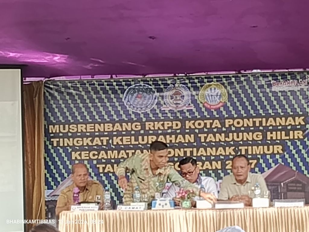Pontianak, Kalbar – Bhabinkamtibmas Kelurahan Tanjung Hilir Polsek Pontianak Timur, Bripka Heri P, menghadiri kegiatan Musyawarah Perencanaan Pembangunan (Musrenbang) RKPD Kota Pontianak Tingkat Kelurahan Tanjung Hilir Tahun Anggaran 2027, yang dilaksanakan pada Selasa, 13 Januari 2026, bertempat di halaman Kantor Lurah Tanjung Hilir, Kecamatan Pontianak Timur.