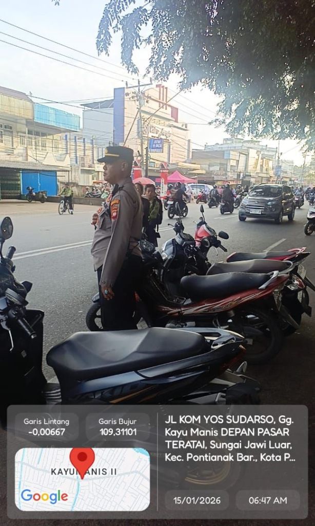 Pontianak, Kalbar – Personil Polsek Pontianak Barat laksanakan giat rutin dengan melaksanakan kegiatan Strong Point Pagi di beberapa sekolah dan pasar tradisional yang berada di wilayah hukum mereka. Dengan tujuan untuk meningkatkan kesadaran akan keselamatan lalu lintas dan menciptakan lingkungan yang aman, Kamis 15/1/2026.