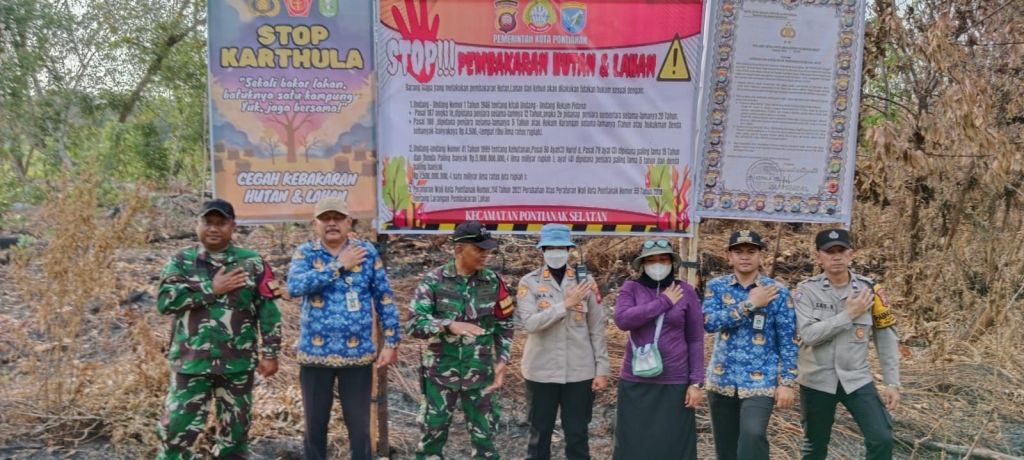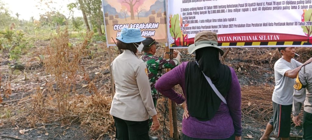 Pontianak Selatan, Polda Kalbar — 29 Januari 2026. Tiga Pilar Kecamatan Pontianak Selatan yang terdiri dari Kapolsek Pontianak Selatan AKP Inayatun Nurhasanah, S.H., Danramil 1207-02 Kecamatan Pontianak Selatan Mayor Inf Supanggih, dan Camat Pontianak Selatan Wulanda Anjaswari, S.STP., M.Si (Han)., melakukan upaya himbauan pencegahan kebakaran hutan dan lahan (Karhutla) dengan memasang spanduk himbauan serta Maklumat Kapolda Kalbar di lokasi kebakaran lahan di Jalan Parit Demang Dalam.