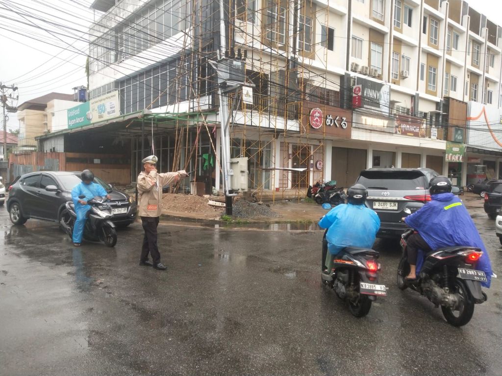 Personel tetap berjaga hingga arus lalu lintas benar-benar kondusif. Kehadiran polisi di tengah hujan mendapat apresiasi dari warga yang melintas.