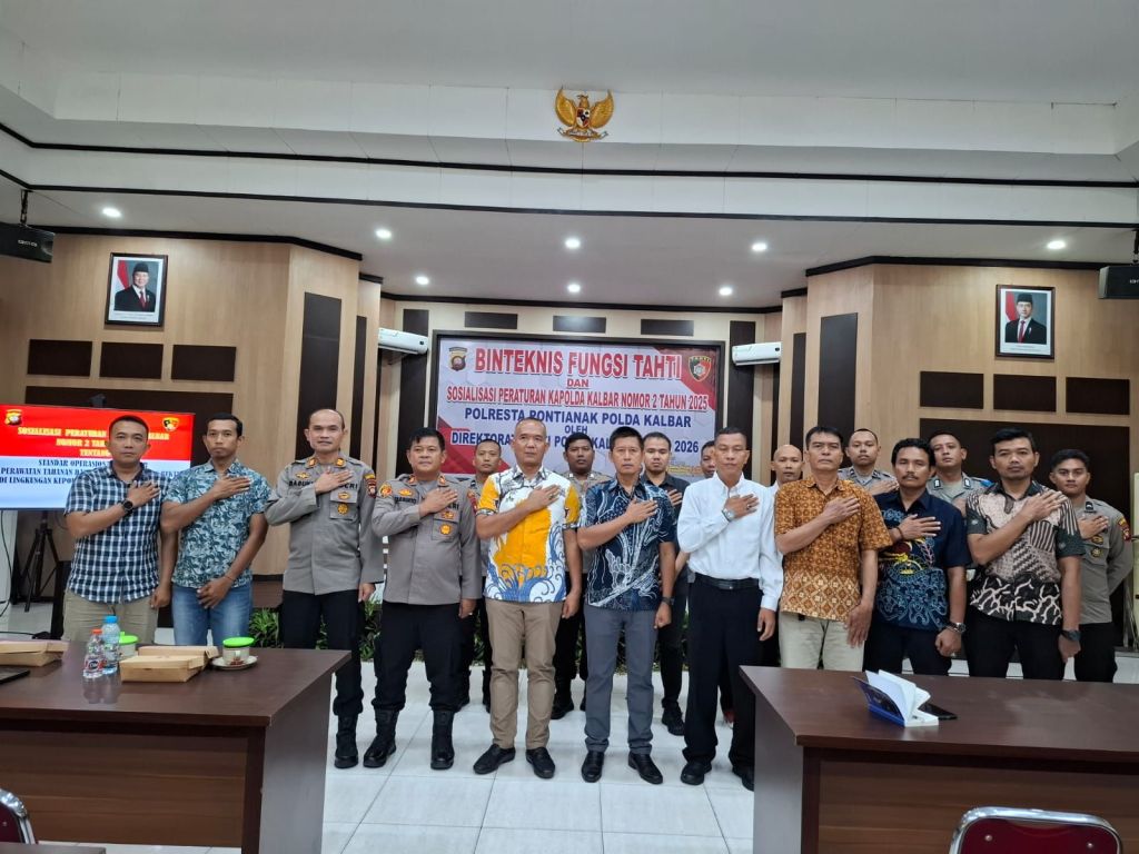 PONTIANAK,Polda Kalbar – Polresta Pontianak melalui Satuan Tahanan dan Barang Bukti (Sat Tahti) menggelar kegiatan Bimbingan Teknis (Binteknis) dan Sosialisasi Peraturan Kapolda Kalbar Nomor 2 Tahun 2025. Kegiatan tersebut dipimpin oleh Dirtahti Polda Kalbar, AKBP Muhamad Syafii, S.I.K., S.H., M.H., dan dilaksanakan pada Jumat (13/02/2026) di Aula Polresta Pontianak.