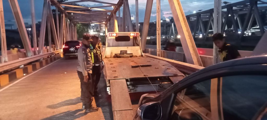 Kendaraan yang mogok tersebut berada tepat di atas jembatan, sehingga menyebabkan perlambatan arus lalu lintas dari dua arah. Melihat kondisi tersebut, personel yang bertugas langsung melakukan pengamanan dan pengaturan arus kendaraan, sekaligus berkoordinasi dengan petugas derek untuk segera mengevakuasi mobil ke tempat yang lebih aman.