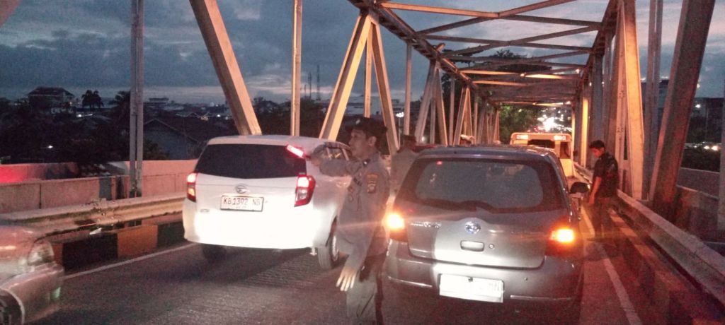 Pontianak, Kalbar – Personel Pos Pengamanan (Pos Pam) Tanjung Raya bersama tim Enggang dari Polsek Pontianak Timur sigap mengatur jalur evakuasi sebuah mobil yang mengalami mogok di kawasan Jembatan Tol Kapuas, Selasa malam (17/2). Evakuasi dilakukan guna mengurai kemacetan yang sempat terjadi akibat kendaraan yang berhenti di badan jalan.(18/2).