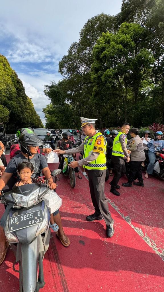 Kegiatan tersebut dipimpin langsung oleh Dirlantas Polda Kalbar Kombes Pol Valentinus Asmoro, S.I.K., M.H., bersama perwakilan Polwan Polda Kalbar. Ratusan paket takjil dibagikan kepada pengendara dan masyarakat yang melintas menjelang waktu berbuka puasa.